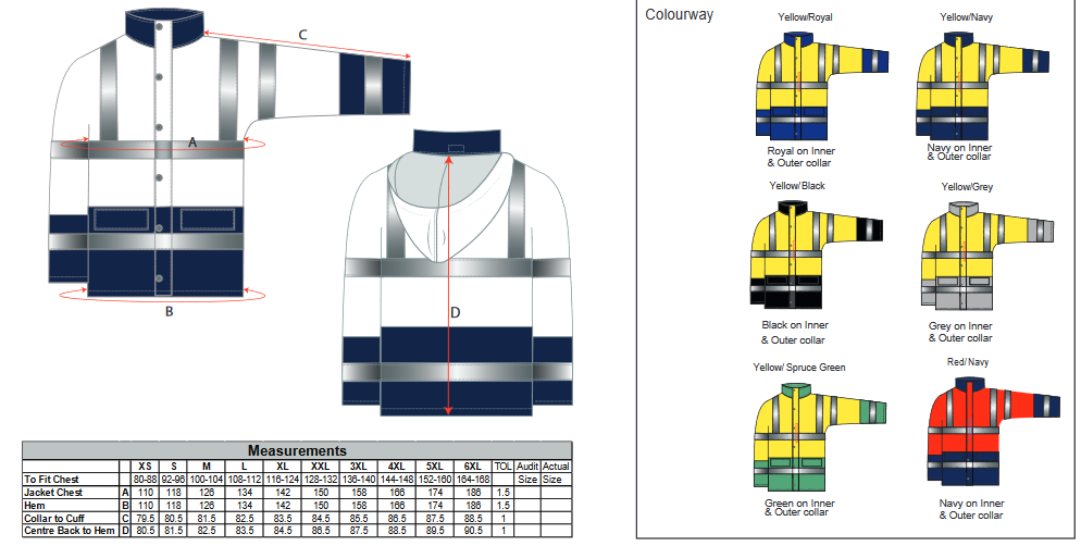 Na piersiach, rękawach, plecach naszyte taśmy odblaskowe.